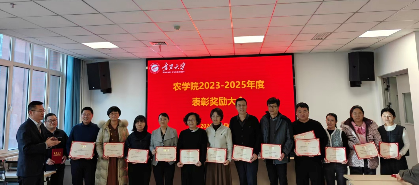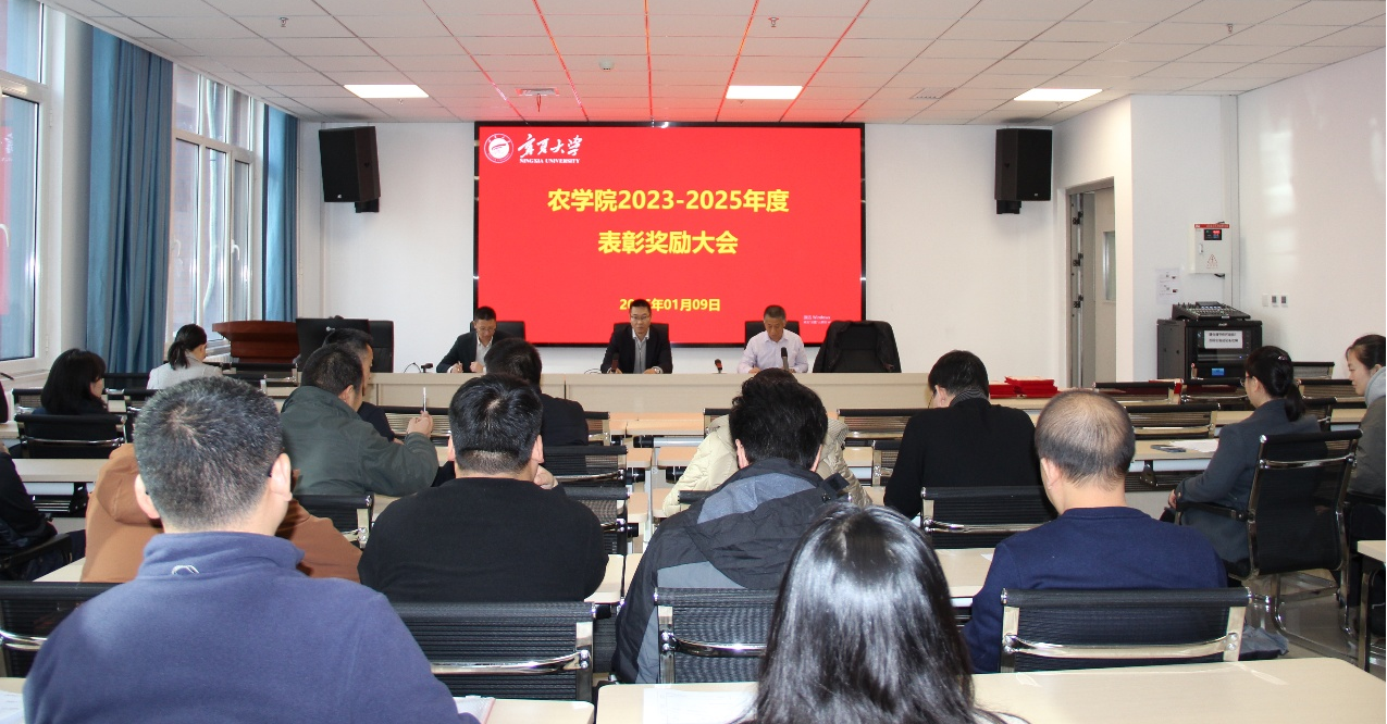 【宁夏大学新闻中心讯 农学院】为表彰先进典型、凝聚奋进力量,进一步激发教职工干事创业的热情与进取精神,营造比学赶超、创先争优的浓厚氛围,1月9日下午,农学院在朔方校区召开2023年至2025年工作优秀人员(团队)表彰大会。大会以“凝心聚力、砥砺前行,共谱学院发展新篇章”为主题,全院教职工齐聚一堂,共同回顾过往成就,擘画未来发展蓝图。会议由副院长王新谱主持。