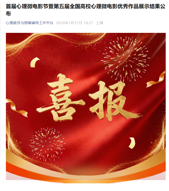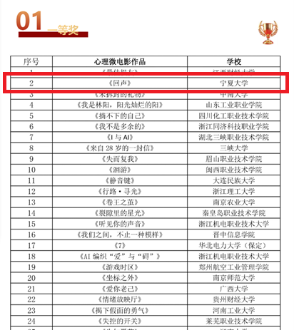 【宁夏大学新闻中心讯 尚德书院】1月21日,由全球文化教育交流委员会、国际心理委员与朋辈支持联盟联合主办的首届心理微电影节暨第五届全国高校心理微电影优秀作品展示结果公布,在213部作品中,我校作品《回声》荣获一等奖,《合群》荣获三等奖,其中《回声》排名全国第二。