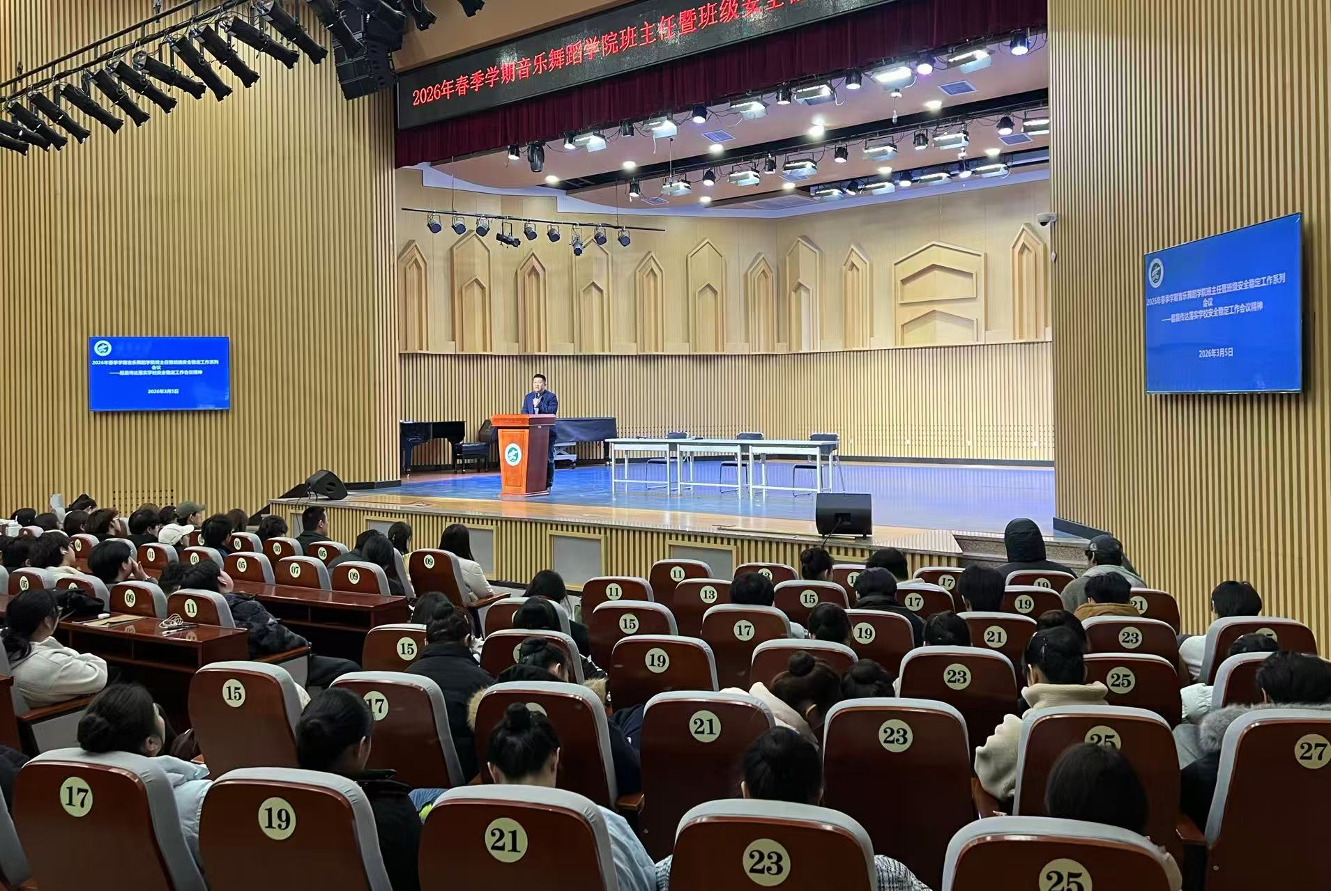 【宁夏大学新闻中心讯 音乐舞蹈学院】3月5日中午,音乐舞蹈学院在音乐厅召开2026年春季学期班主任暨班级安全工作会议。全院11个班级的班主任及全体学生参加会议,会议由学院党总支书记贾述道主持。