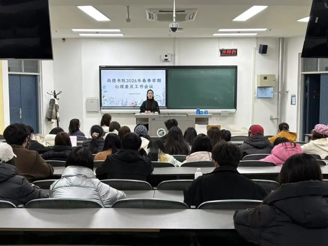 【宁夏大学新闻中心讯 尚德书院】3月15日,尚德书院心理健康中心召开2026年春季学期工作会议。书院副院长王艳梅、心理健康中心负责人阿丽叶·卡哈尔出席,兼职辅导员郭亚楠主持,全体本硕班级心理委员参加会议。