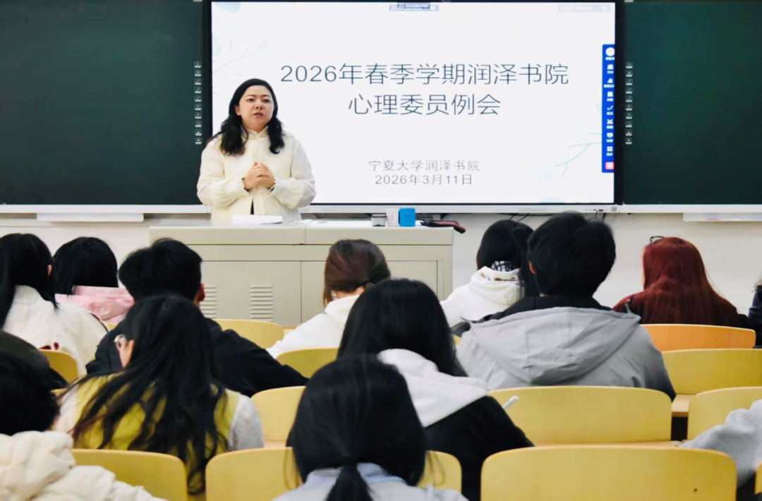 【宁夏大学新闻中心讯 润泽书院】为深入贯彻落实学校学生心理健康工作部署,持续加强书院心理委员队伍建设,明确新学期工作职责,3月11日下午,润泽书院于文萃一教111室召开2026年春季学期心理健康工作会议。校心理健康咨询中心陈婧老师、书院副院长陈楠出席会议,书院心理健康中心主任陈晶主持,全体心理委员参会。