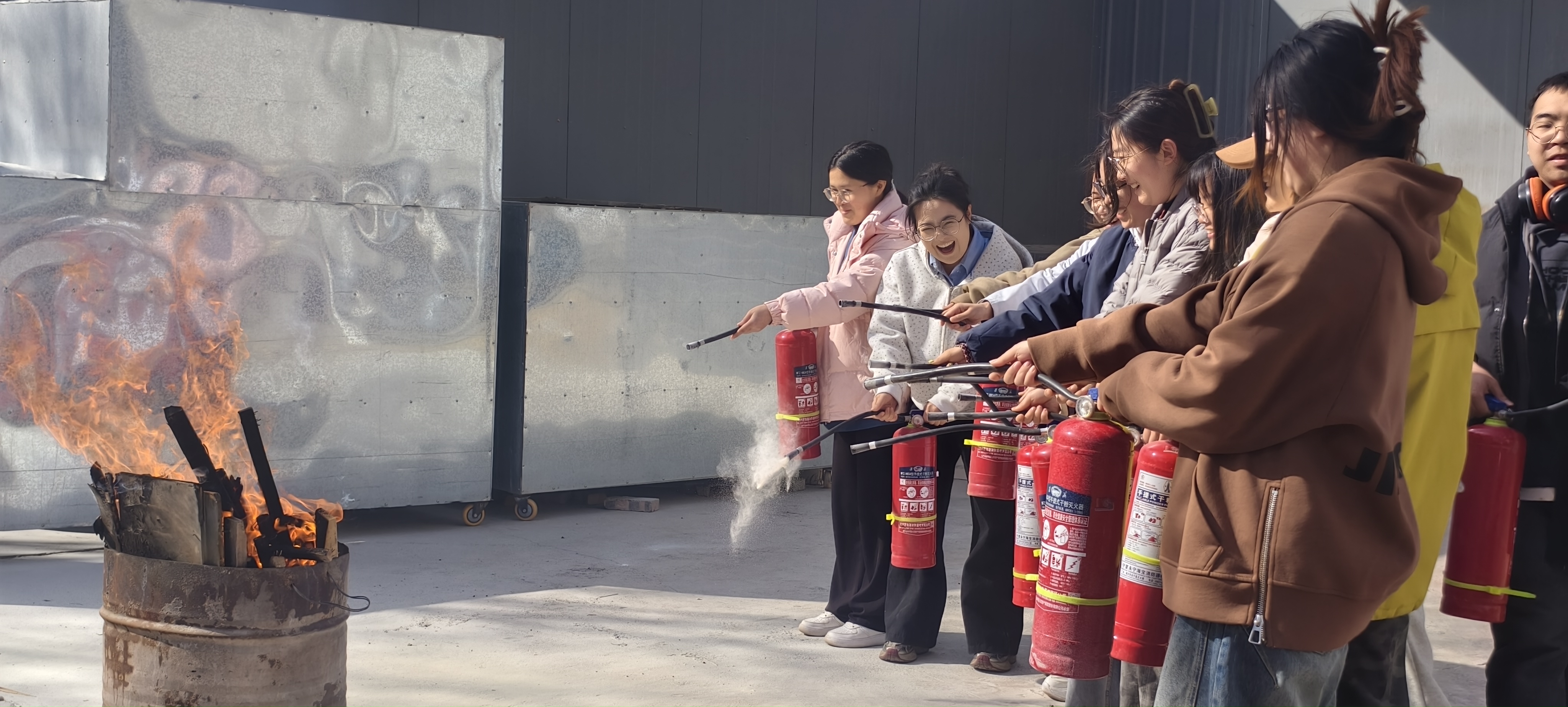 培训结束后,全体人员来到演练场,开展灭火器实操“大练兵”。高一博首先讲解了干粉灭火器的原理与检查要点,随后亲自示范了“提、拔、瞄、压”四步操作法,并逐一分解动作要领,强调站位与心态的重要性。在“实战”环节,同学们跃跃欲试,在指导下,分批次对准模拟火源进行扑救。从初次尝试的紧张到成功灭火后的从容,同学们在实践中真正掌握了这一关键消防技能,有效提升了面对真实火情时的心理素质与处置信心。