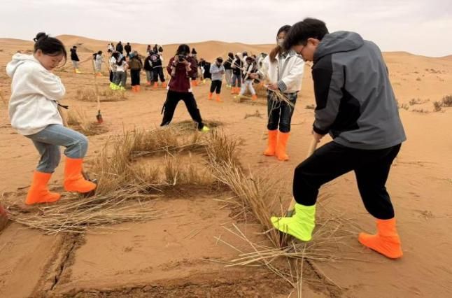 活动中,专业治沙人员为学子们详细讲解麦草方格的治沙原理与实操技巧,从技术原理到操作规范,细致拆解每一步流程,让中外学子深刻理解这一生态奇迹背后的匠心与坚守,读懂中国治沙人久久为功的执着精神。同学们分工协作、躬身实践,挥锹压草、规整方格,亲手将麦草扎成一道道固沙屏障,真切感受中国生态文明建设的非凡成就,纷纷赞叹中国治沙智慧的独特魅力。