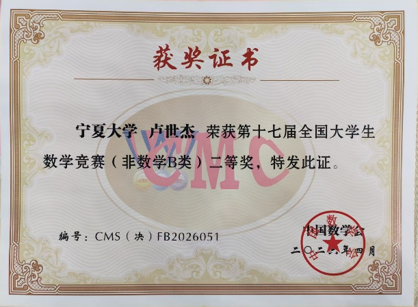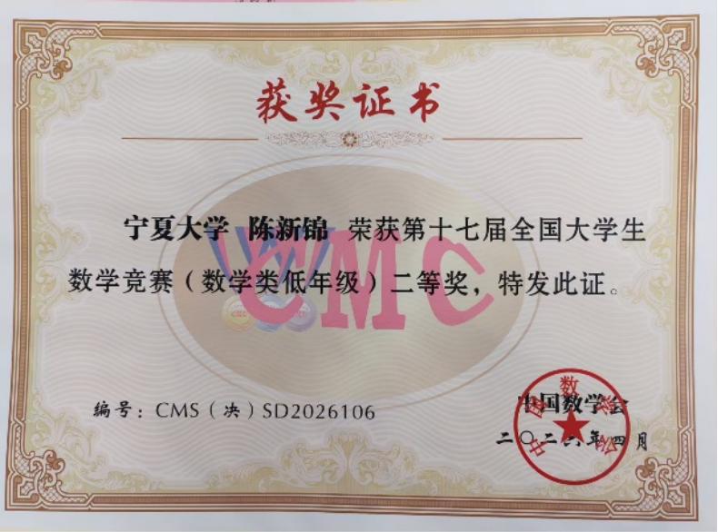 【宁夏大学新闻中心讯 数学统计学院 】4月17日至19日,第十七届全国大学生数学竞赛决赛在四川大学和成都理工大学两个考点举行。我校选派的7名学生共获得二等奖3项、三等奖4项。