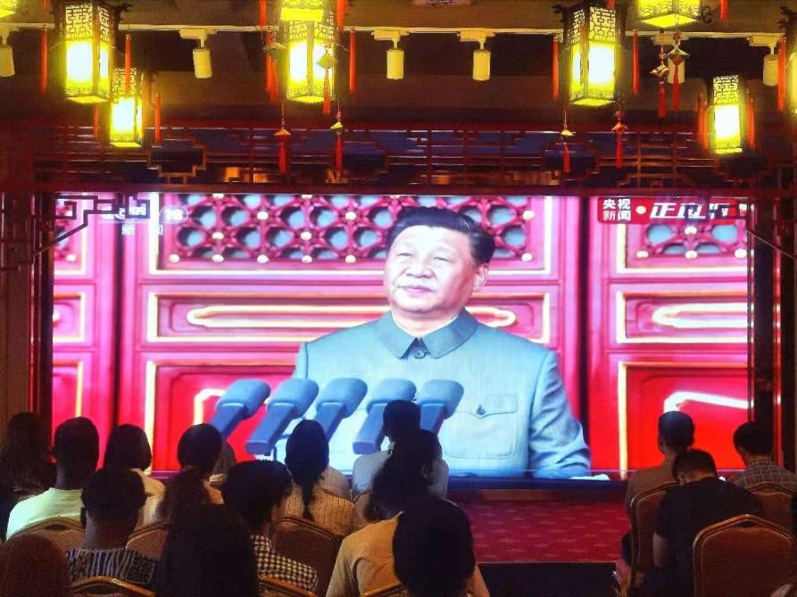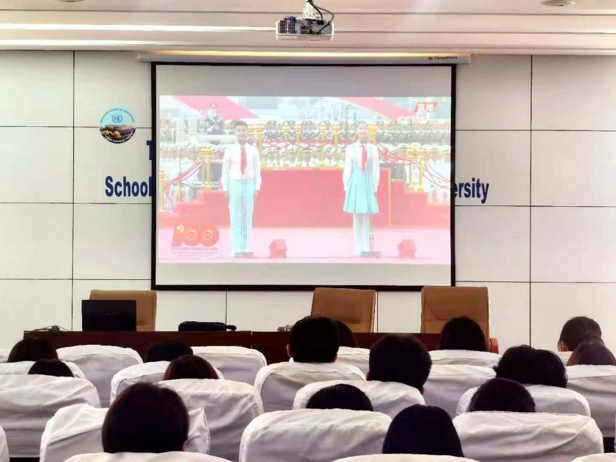 中外师生与北京会场参会代表一起全程观看庆祝大会,一起亲眼目睹了空中护旗队驭风飞越送祝福,歼10歼20战鹰英姿飒爽展雄风,鸣炮百响声声震寰宇,国旗护卫队百步亮相正气节,青少年铿锵有力诵誓言,各民主党派工商联、无党派人士联合各界,共送祝福,同庆盛世的感人画面。