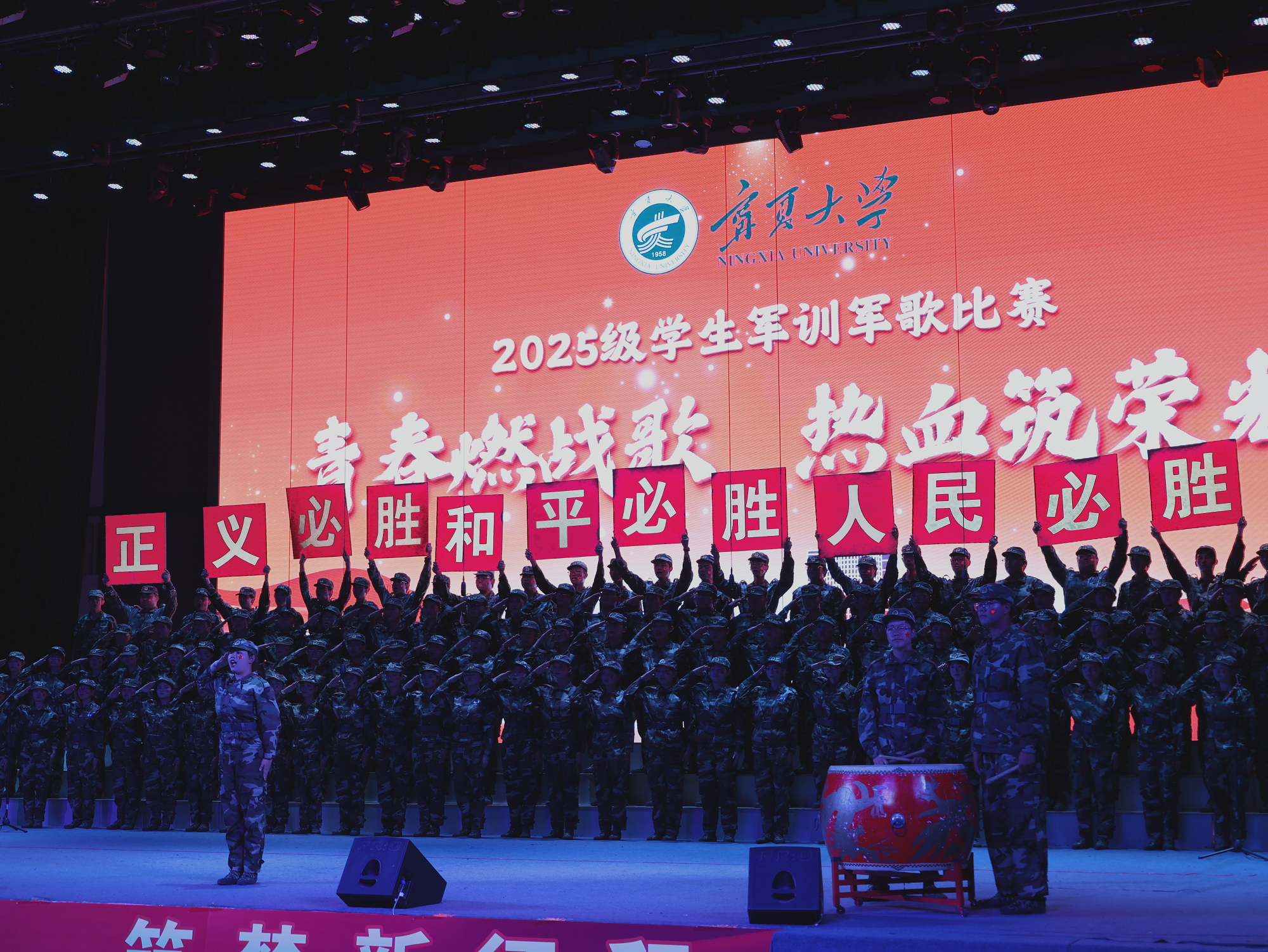 【宁夏大学新闻中心讯 校团委/文 学生记者:邸靖淳 谢春雨/图】为深入学习贯彻习近平新时代中国特色社会主义思想,纪念中国人民抗日战争暨世界反法西斯战争胜利80周年,弘扬伟大抗战精神、加强2025级本科生国防教育,9月8日晚,宁夏大学2025级学生军训军歌比赛在文萃校区国家大学生文化素质教育基地举行,军训团全体教官、各书院辅导员及2025级全体参训学生共同参加比赛。
