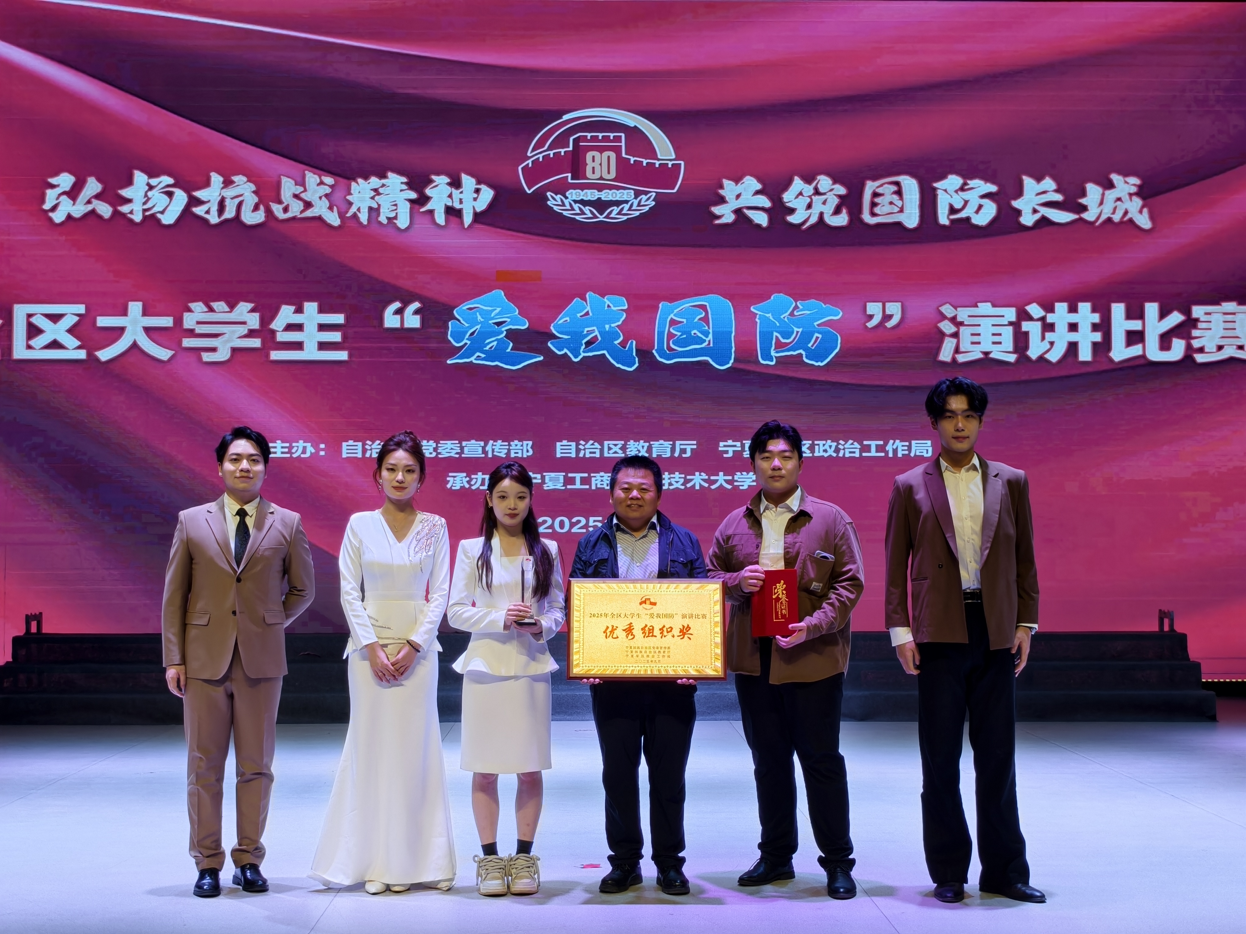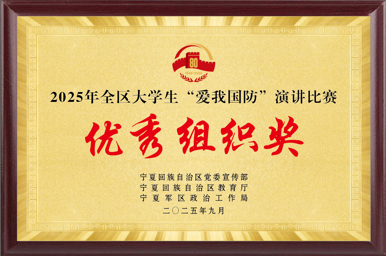 【宁夏大学新闻中心讯 人民武装部(国防教育教学中心)】9月26日,由自治区党委宣传部、自治区教育厅、宁夏军区政治工作局共同主办的2025年全区大学生“爱我国防”演讲比赛决赛在宁夏工商职业技术大学圆满落幕。我校选送的作品《一代人有一代人的国防情》从参赛的全区19所高校中脱颖而出,荣获一等奖,学校荣获优秀组织奖。