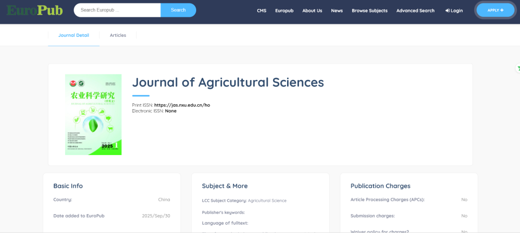 【宁夏大学新闻中心讯 学术期刊中心】近日,由宁夏大学主办的《宁夏大学学报(自然科学版中英文)》《西北工程技术学报(中英文)》和《农业科学研究(中英文)》期刊,正式被国际知名学术数据库EuroPub收录。此次入选是期刊发展历程中的一个重要里程碑,标志着我校主办的学术期刊在自然科学、工程技术及农业科学领域的研究成果与办刊质量获得了国际认可,对提升我校学术影响力、推动国际化学术交流具有重要意义。