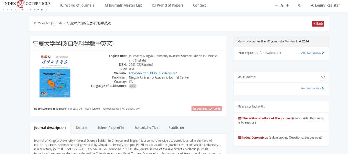 【宁夏大学新闻中心讯 学术期刊中心】近日,由宁夏大学主办的《宁夏大学学报(自然科学版中英文)》《西北工程技术学报(中英文)》《农业科学研究(中英文)》期刊,正式被ICI World of Journals(波兰哥白尼期刊数据库)收录。此次入选,标志着三种期刊的学术质量与国际影响力再次获得了国际重要检索系统的认可,是我校学术期刊走向国际化进程中的又一重要里程碑。