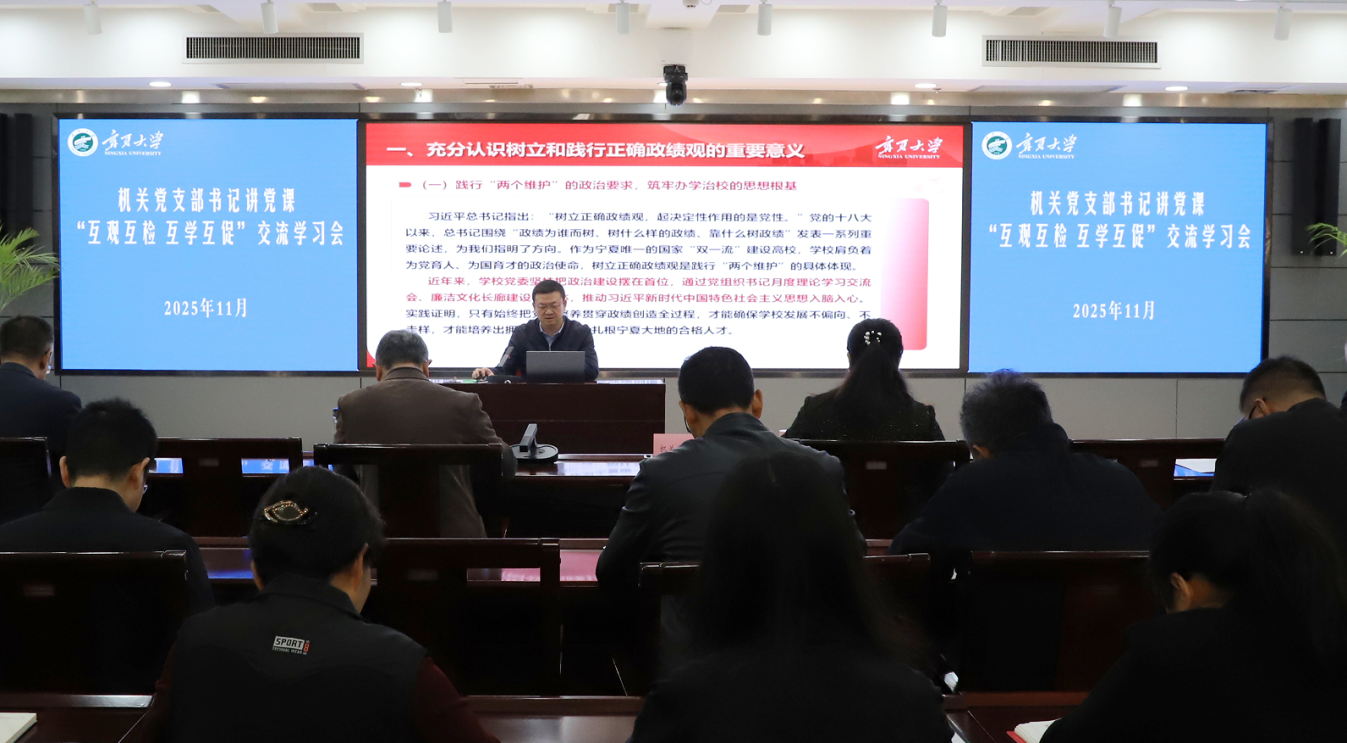 【宁夏大学新闻中心讯 党委组织部】11月4日,机关党支部书记讲党课“互观互检 互学互促”交流学习会在德勤楼六楼会议室举行,机关党委委员、机关各党支部书记、副书记、全体支委、青年党员代表参会,机关党委书记张永丽主持会议。
