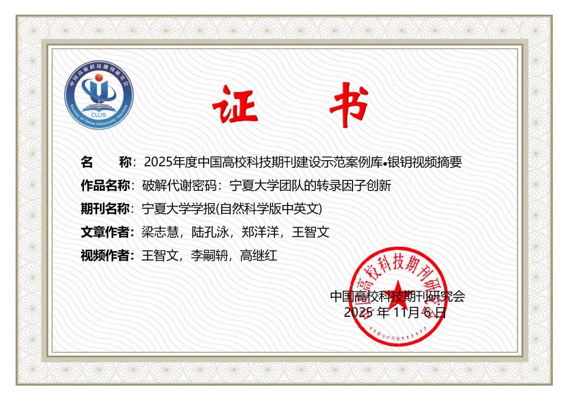 此次评选中,《农业科学研究(中英文)》编辑部成功入选“2025年度中国高校科技期刊建设示范案例库·优秀团队”,《宁夏大学学报(自然科学版中英文)》推送的视频作品《破解代谢密码:宁夏大学团队的转录因子创新》荣获“中国高校科技期刊建设示范案例库·银钥视频摘要”。