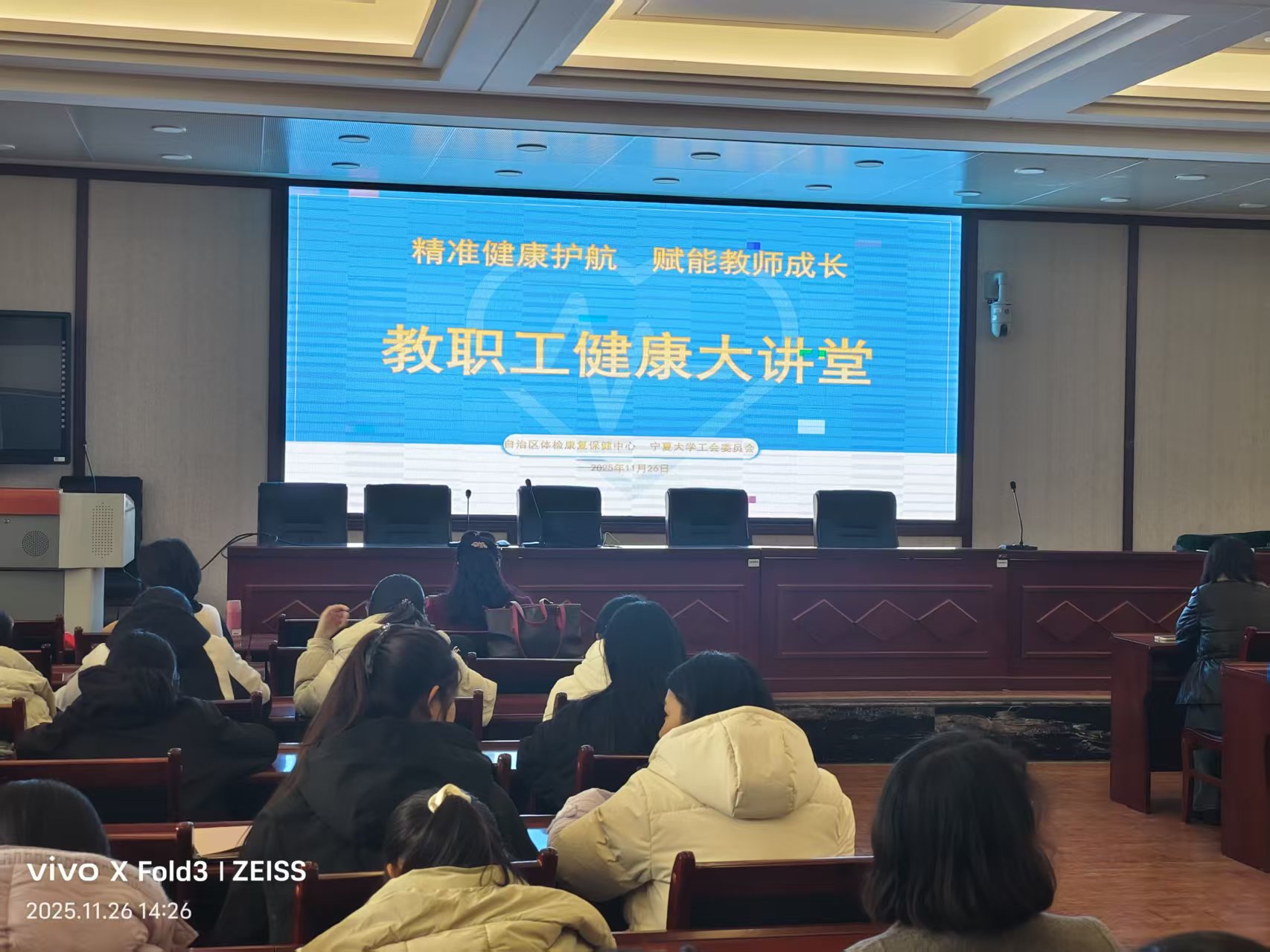 【宁夏大学新闻中心讯 校工会】为依托自治区体检康复保健中心的专业资源优势,为教职工提供精准、权威的健康指导,11月26日,校工会联合自治区体检康复保健中心在怀远校区举办教职工健康宣讲活动,我区医疗专家受邀为教职工讲授健康管理知识和女性保健知识,校工会常务副主席牛建军参加活动,校工会副主席王红枫主持活动。