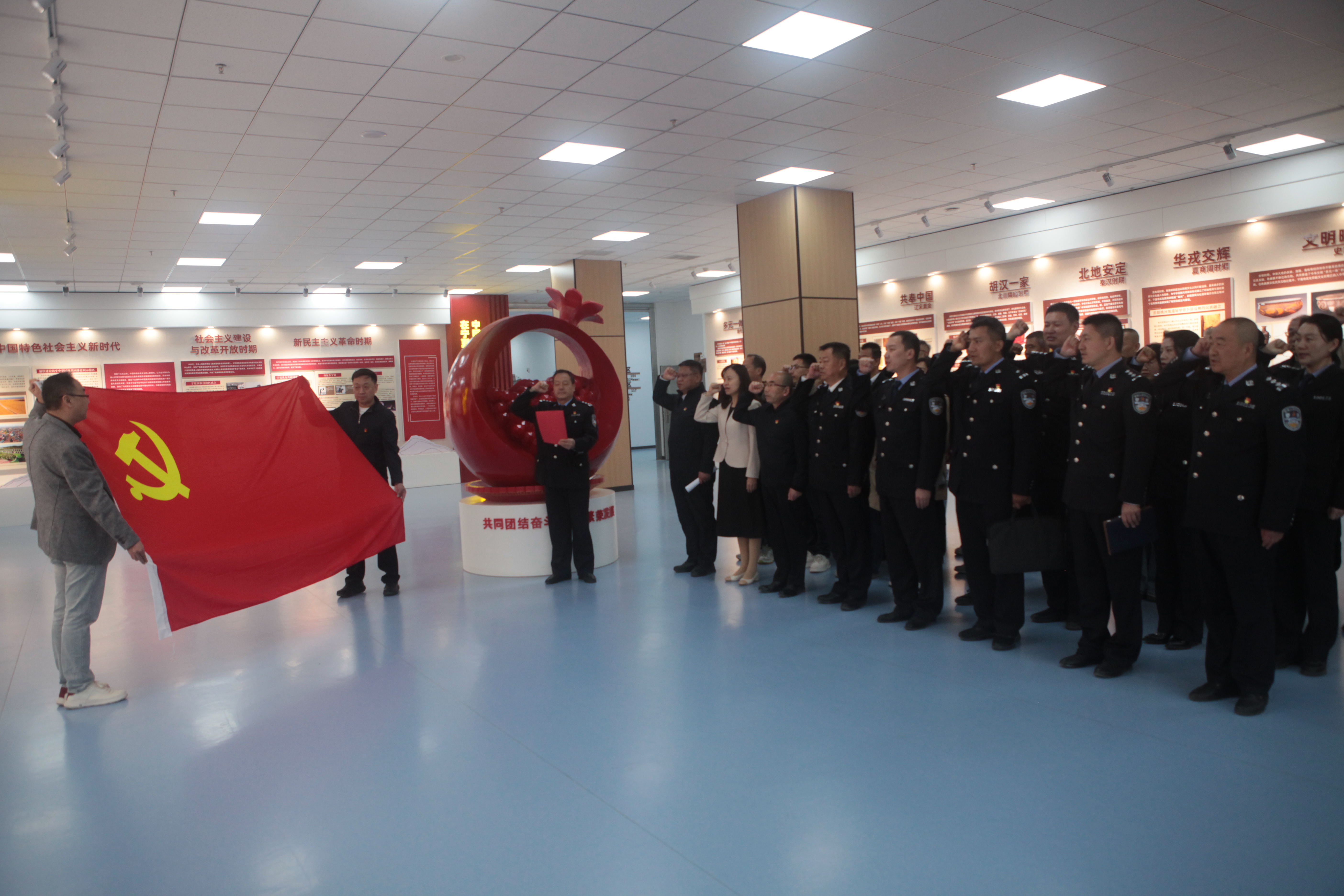 在学校“石榴花开润塞上——宁夏铸牢中华民族共同体意识实践展馆”,面对鲜红的党旗,三方党员代表整齐列队,高举右拳,在党旗下重温入党誓词。