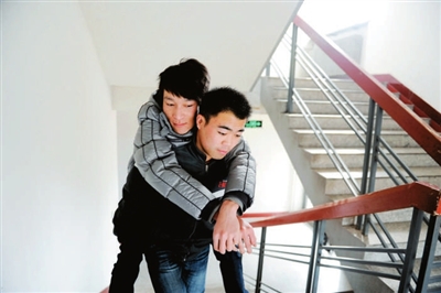 4年来,5名舍友背着李进福上下课、吃饭、洗澡、散步,像亲人一样守护在他身边——