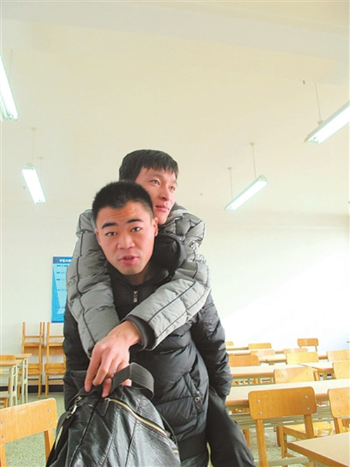 刚上大一时,从宿舍到教室只需5分钟就走完的路,李进福扶着墙走了半个小时。看到此情景后,班长郝杰主动当起了李进福的“腿”背他上课。不久,同宿舍的山东小伙张志博从郝杰手里接下背李进福上学的“接力棒”,这一背就是3年多时间。
