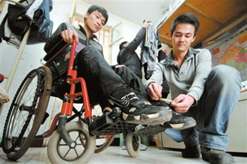 张志博、马渊博、马少波和冯占国是李进福的室友,从大学一年级开始,他们便每天轮流照顾李进福,背着他爬楼梯去教室上课,推着轮椅带他上厕所,甚至还要帮他穿外套和系鞋带,学校还给他配备了一辆电动车。“没有他们我真不知道怎么度过这四年的大学生活,”李进福感慨地告诉记者,“他们就是我的腿!”