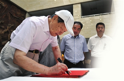 参观完展厅,杨振宁应邀为银川世界岩画博物馆题词,他提笔写下“岩画博物馆之创建是中华文化复兴的象征”,落款写得极为认真。有人提议让翁帆女士写下感受时,被婉谢:“我签个自己的名字就可以了”。