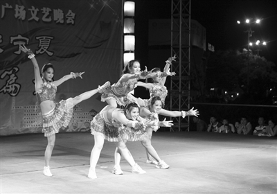 5月29日晚,在银川市光明广场,来自宁夏大学的学生们在表演健美操。