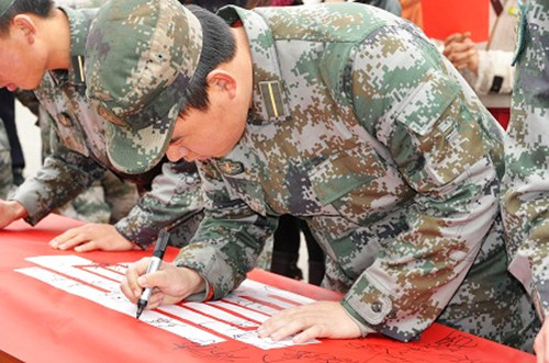 宁夏大学国防生在学习雷锋精神万人签名活动现场签名。