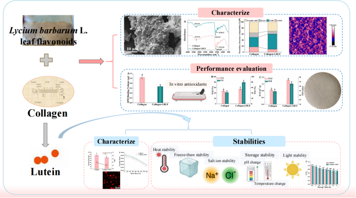 【宁夏大学新闻中心讯 食品科学与工程学院】近日,食品科学与工程学院食品营养与健康创新团队范艳丽教授课题组在Food Research International(1区,IF8.1)发表题为“Stability protection of lutein emulsions by utilizing a functional conjugate of collagen andLycium barbarumL.leaf flavonoid”的研究性论文(胶原蛋白和枸杞叶黄酮的功能复合物对叶黄素乳液稳定性的保护作用)。