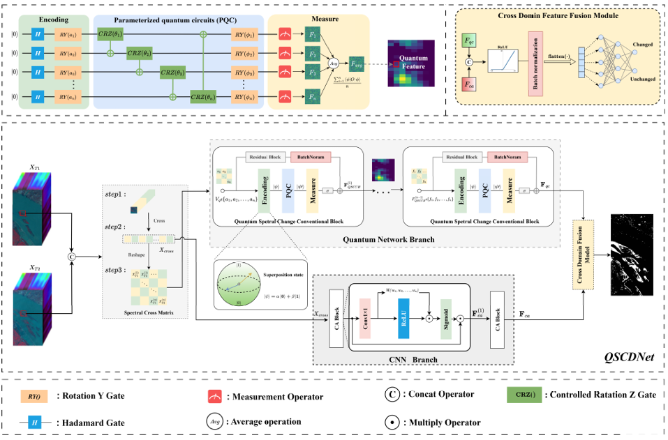 本论文提出了一种面向高光谱影像变化检测的双分支混合量子神经网络 (QSCDNet),其核心是基于高维希尔伯特空间建模光谱变化的不确定性问题。该网络包含以下核心模块:1)量子分支,由多个二维量子光谱变化卷积块构成,通过参数化量子电路建模独立于伪变化影响的光谱变化多样化表达形式,从而更有效地提取光谱特征变化信息; 2)CNN分支,基于通道注意力网络架构设计,提供传统网络的特征变化表征; 3)跨域特征融合模块,融合量子分支与CNN分支的输出特征,实现变化信息的互补增强。该方法在三个公开高光谱变化检测数据集上进行了测试,并与前沿相关方法进行对比,证明了量子计算处理高光谱遥感数据的应用潜力。