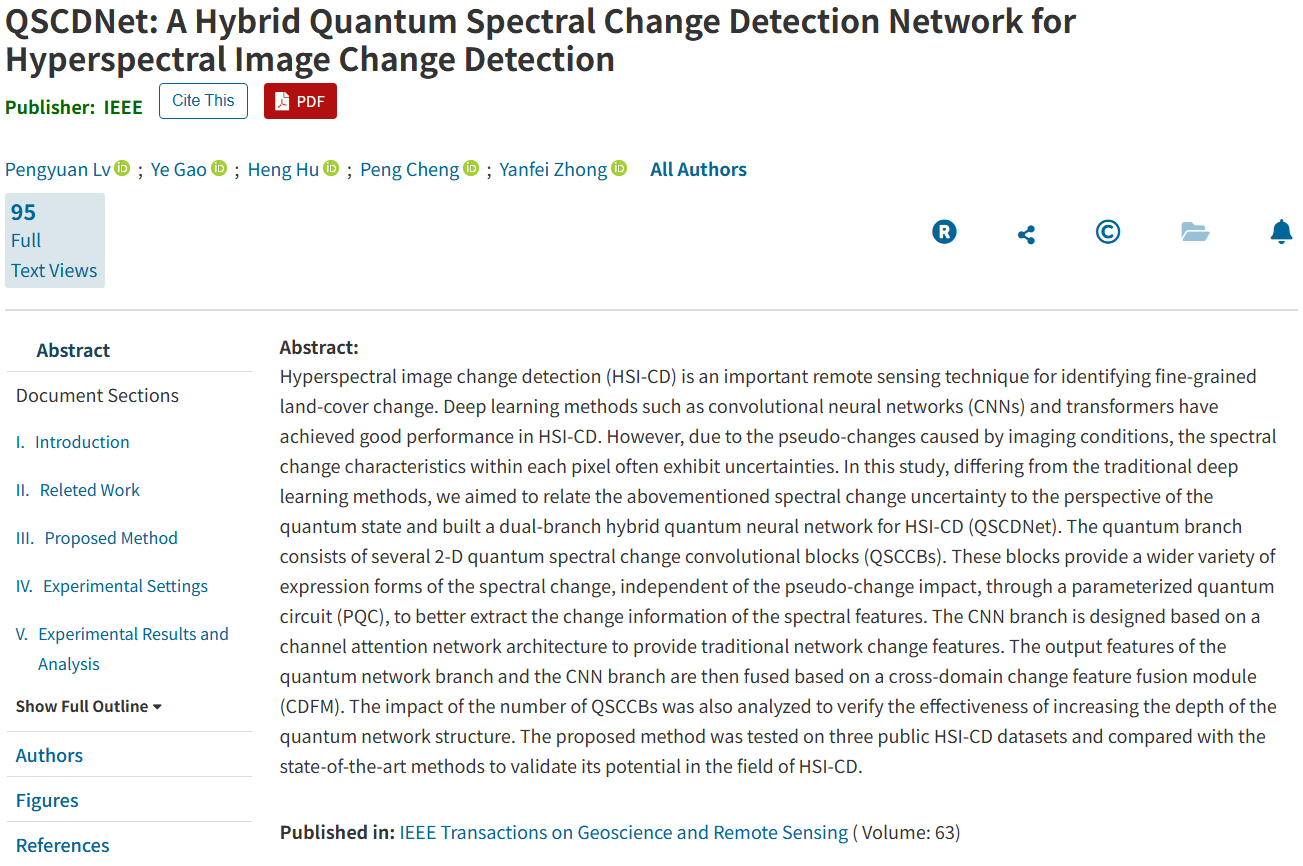 【宁夏大学新闻中心讯 数学统计学院】近日,我校数学统计学院胡衡教授团队和信息工程学院吕鹏远副教授团队在国际地球科学和遥感领域顶级期刊《IEEE Transactions on Geoscience and Remote Sensing》(中科院1区 TOP IF:8.6)联合发表题为《QSCDNet: A Hybrid Quantum Spectral Change Detection Network for Hyperspectral Image Change Detection》的论文,吕鹏远副教授为第一作者,胡衡教授为通讯作者。该论文探索了量子计算在高光谱遥感影像解译中的应用,为高效精准解译遥感数据提供了新思路,被审稿人认为“The quantum computing provides a new way for hyperspectral image processing”。
