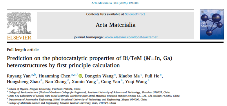 【宁夏大学新闻中心讯 物理学院】12月15日,我校硕士生严汝阳以宁夏大学为第一单位,在金属材料国际顶级期刊《Acta Materialia》(中国科学院一区TOP期刊,近五年影响因子10.2,近10年年均发文量798.7篇)上在线发表最新研究成果Prediction on the photocatalytic properties of Bi/TeM (M=In, Ga) heterostructures by first principle calculation(Volume 304, 1 January 2026, 121804,)。论文唯一通讯作者为其导师陈焕铭教授(稀有金属特种材料全国重点实验室学术委员会委员,宁夏晶体学会副理事长)。该文第一作者目前已顺利进入南方科技大学攻读博士学位。