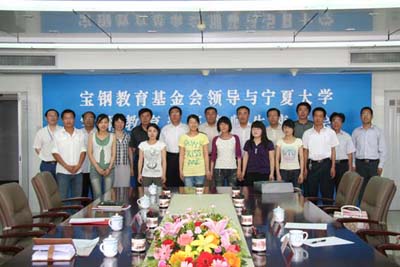 【宁夏大学新闻中心讯 学生处】6月5日,宝钢教育基金会秘书长樊纯诗一行来我校考察。自治区党委副秘书长、校党委书记荣仕星,校长何建国,党委副书记撒承贤会见了樊纯诗秘书长一行。荣仕星书记对樊纯诗秘书长一行的到来表示热烈的欢迎。他介绍了宁夏大学最近几年的发展情况及宁夏的风土人情和旅游文化,希望樊纯诗秘书长一行能够更多的了解宁夏大学和宁夏。樊纯诗秘书长介绍了最近几年宝钢的发展情况以及宝钢将来的发展目标,宝钢教育基金评选等方面的情况。