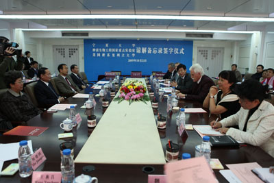 【宁夏大学新闻中心讯 党委宣传部】10月21日,美国密苏里州立大学副校长詹姆士·贝克博士率团访问我校并在A区主楼11楼会议室签订《宁夏大学·种苗生物工程国家重点实验室·密苏里州立大学理解备忘录》(以下简称《备忘录》)。自治区党委常委、组织部部长徐松南,自治区党委组织部副部长、自治区人才工作领导小组办公室副主任艾矛,自治区教育厅厅长郭虎,自治区科技厅厅长马清贵,宁夏大学党委书记齐岳、校长何建国、副校长王燕昌,宁夏种苗生物工程国家重点实验室主任李健等出席签字仪式。签字仪式由王燕昌副校长主持。