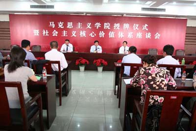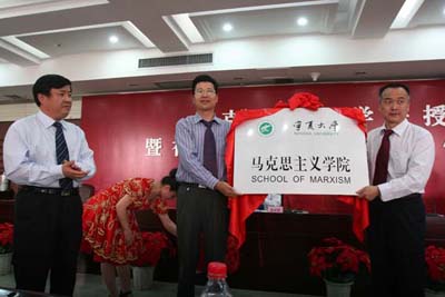 校党委副书记吴世彩在会上讲话。他代表学校党委、行政向马克思主义学院的成立表示祝贺。他说,为了深入贯彻落实中共中央、国务院《关于进一步加强和改进大学生思想政治教育的意见》和中共中央宣传部、教育部《关于进一步加强和改进高等学校思想政治理论课的意见》的精神,适应我校“211工程”建设和学校转型发展的需要,学校党委经过认真研究,决定将宁夏大学思想政治理论课教学研究部更名为马克思主义学院。这是学校全面贯彻党的教育方针,落实德育工作的一项重要举措;同时也是为了把我校公共理论教学科研部门努力办成全区马克思主义教育、研究和培训的重要平台,成为我校思想政治教育的重要基地的一项具体举措。这一举措顺应新形势下高等学校培养中国特色社会主义事业合格建设者和可靠接班人的要求,符合思想政治理论教育向纵深发展的时代需求。他希望马克思主义学院要以更名为契机,进一步整合资源、集中力量,努力在思想政治理论课教育、教学、科研等方面大做文章、做大文章,有所作为,有大作为。他要求马克思主义学院要谋划新的发展目标,推出新的科研成果,培养汇聚优秀人才,拓展对外交流。吴世彩副书记指出,学校将一如既往地支持马克思主义学院的建设和发展。希望马克思主义学院每位师生都能站在这个新的平台上,积极创新发展模式,努力推进理论创新,为把宁夏大学建设成具有区域特色的高水平教学研究型大学做出新的贡献。