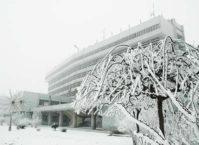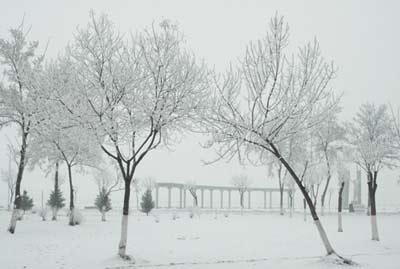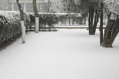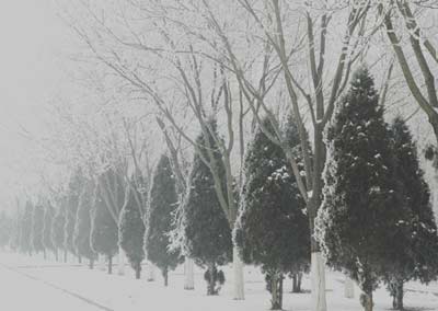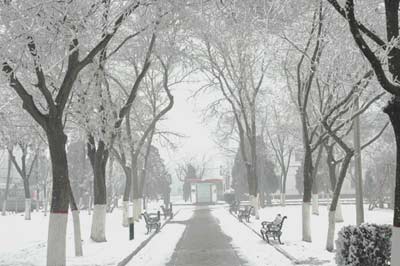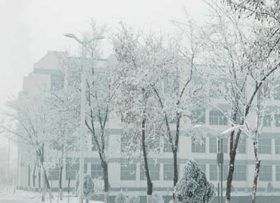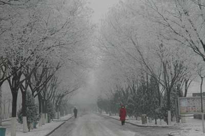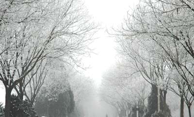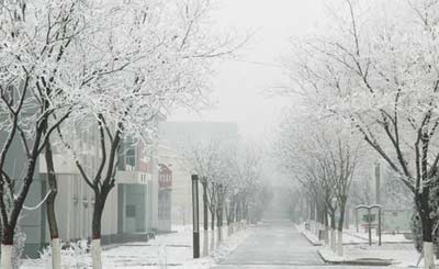 雾凇凝附在树枝上,婀娜多姿,宛若琼树银花,清秀雅致。地面上像一层厚霜,远远望去,校园雾气蒙蒙,大地一片洁白,此时情不自禁地想起“此曲只应天上有,人间能得几回闻”的句子!眼前琼枝玉叶,美不胜收。置身雾凇世界,恍如步入琼山玉林的仙境。