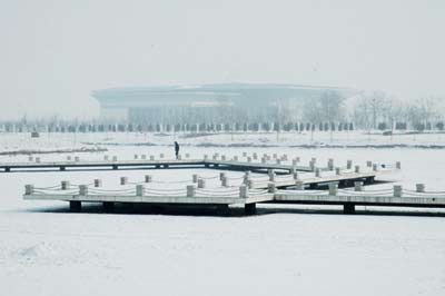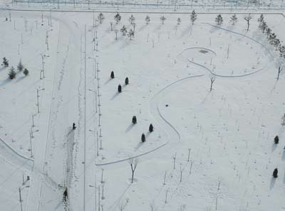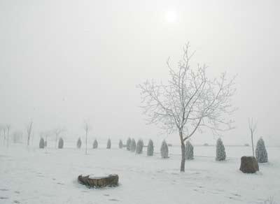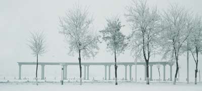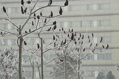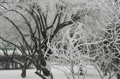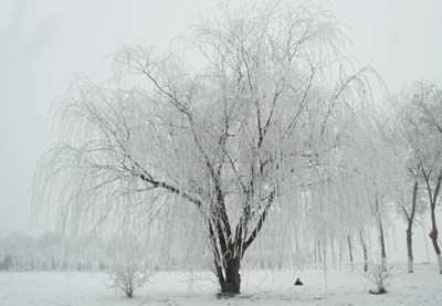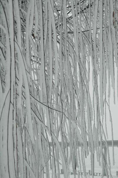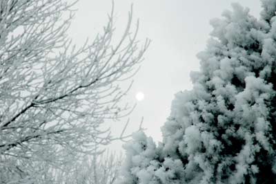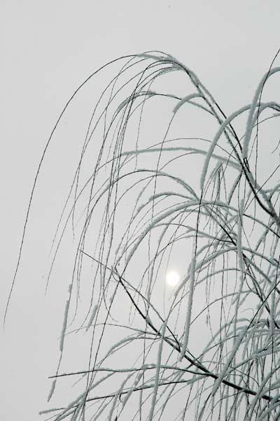上午11时许,太阳一露面儿,微风掠过,雾凇便“落英缤纷”了。庆幸的是我用数码相机捕捉了千余幅雾凇风景。这正是: