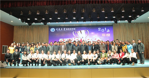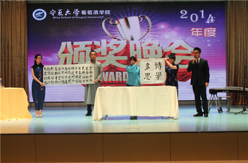 【宁夏大学新闻中心讯 葡萄酒学院/文 王大伟、龚旭峰/图】12月12日晚,葡萄酒学院2014年终总结暨颁奖晚会在学院文化活动中心隆重举行。校党委副书记赵利宁,副校长、葡萄酒学院院长谢应忠、金龙集团董事局主席、学院董事长刘金虎以及学校相关部门负责人参加了颁奖晚会。