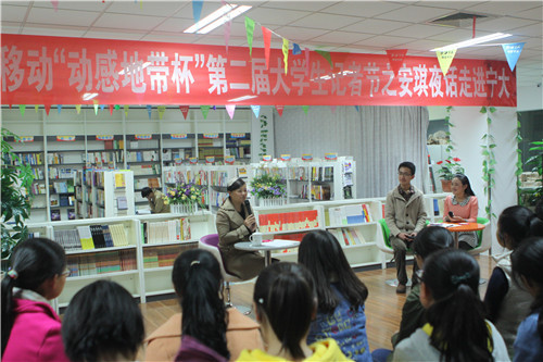 【宁夏大学新闻中心讯 学生记者 张娜 刘凌/文 苏雯/图】你的故事我的歌,夜语宁大论青春。10月30日晚,由校党委宣传部主办、校园广播站承办的“安琪夜话进宁大”活动在C区博亚书店举行。宁夏广电总台主持人安琪、校记者团、广播站级网络文明传播志愿者协会成员参加了此次活动。