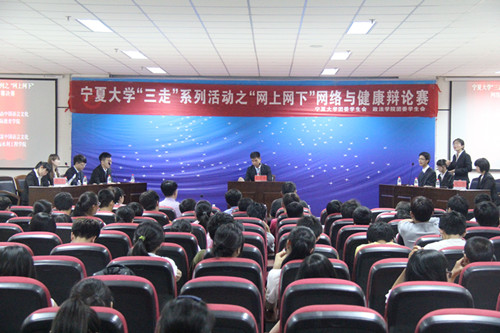 【宁夏大学新闻中心讯 团委】近日,由校团委主办,政法学院团委、学生会承办的宁夏大学“三走”系列活动之“网上网下”网络与健康辩论赛决赛在校本部A区文科楼模拟法庭举办。校团委副书记马慧、政法学院党委副书记崔明堂及参加决赛的代表队同学和观众300余人观看并参加了本次比赛。