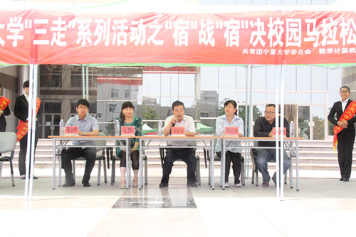 【宁夏大学新闻中心讯 团委】6月4日,由校团委主办,数学计算机学院团委、学生会承办的宁夏大学“走下网络、走出宿舍、走向操场”大学生主题群众性课外体育锻炼系列活动之“宿”战“宿”决校园马拉松闯关赛在校本部B区举行。数学计算机学院党委书记刘富祥、常务副院长韩惠丽、校团委副书记马慧、校学生会主席夏金柱及各学院参赛代表队参加了比赛。