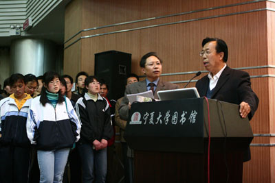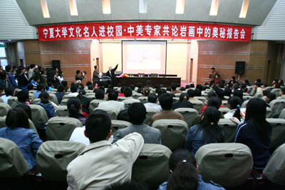 4月13日晚,我校校本部B区逸夫图书馆报告厅座无虚席,掌声雷动。美国鹿谷岩画中心主任、亚利桑那州立大学人类学博士、皮特·威尔士教授,美国岩画保护委员会主任、美国岩画协会主席马歇尔·列先生,银川市贺兰山岩画管理处主任、宁夏大学西夏学研究中心兼职教授贺吉德先生济济一堂,为我校师生作题为“岩画中的奥秘”的专题报告。美国考古专家亨利J·沃特,中央民族大学岩画学博士苏盛,原宁夏博物馆馆长、宁夏文物局副局长、国际岩画委员会委员周新华,宁夏岩画研究院主任乔华女士,内蒙古乌海市文化局梁振华副研究员,宁夏岩画研究院全体人员和我校400余名师生出席和参加报告会。校党委宣传部部长鲁晋主持报告会。