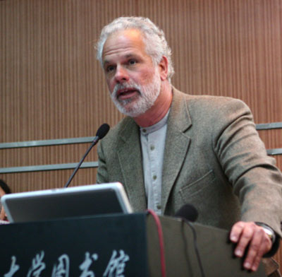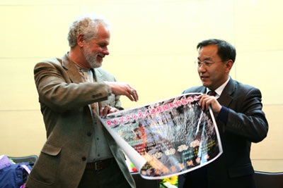 皮特·威尔士教授利用多媒体演示了美国西南地区犹他州、加州、新墨西哥州岩画的分布状况,介绍了该地区岩画的特点,系统阐述了这些岩画所反映出的文化特征。其中他说,他发现中国内蒙古自治区乌海市境内的部分岩画与美国犹他州的部分岩画非常相似,这惊人的发现有利于促进两国的文化交流。马歇尔·列先生就美国岩画保护目的、方式进行了说明,介绍了美国岩画研究中心的情况,指出岩画保护是一个全民行动,并呼吁中国学者及其在校大学生积极参与到岩画保护的志愿者行列中来。贺吉德教授介绍了贺兰山岩画的分布特点、内容、年代、数量和大麦地岩画的情况,认为中国与美国学者在岩画研究方面的合作空间非常大。同时,他告诉大家一个喜讯,贺兰山岩画在2006年1月被国家建设部公布为第一批中国国家自然文化遗产预备名单,贺兰山岩画4月8日被全国31家都市类报纸和网上投票评选为中国最值得外国人去的50个地方之一。