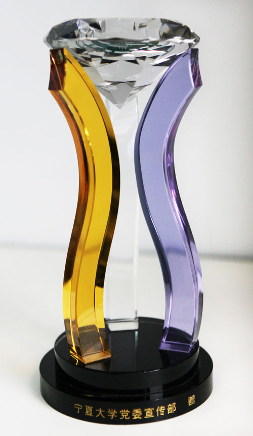 作品说明:本工艺品系专为“宁夏大学社会·文化名人进校园”活动设计制作的纪念品,水晶材质,由黑白色双层底座、三色弯柱和圆锥形新星三部分组成。黑白色双层底座寓意西部沃土,黄、白、蓝三色弯柱分别代表了具有蜡烛精神的教师、如玉待雕的学生和加快发展的社会,圆锥形新星代表着宁夏大学这颗西部高校的后起之星。作品整体寓意为:在教师、学生和社会三股力量的支撑及努力下,宁夏大学这所“区域特色鲜明、服务地方能力较强的高水平教学研究型大学”必将在中国高等教育领域中异军突起,以其坚定践行高等教育服务功能的实际行动矗立在宁夏这片西部沃土之上,成为西部地区高校中一颗冉冉升起的新星!