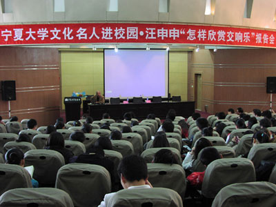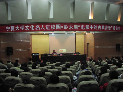【宁夏大学新闻中心讯 王进科 王正】11月7日—8日,沈阳音乐学院音乐学系主任兼音乐研究所所长、硕士生导师彭永启教授,全国西方音乐学会常务理事、武汉音乐学院硕士生导师汪申申教授,教育部艺术教育委员会委员沈致隆教授三位大师携手走进我校文化名人进校园活动,分别为我校师生作了《电影中的古典音乐》、《怎么欣赏交响乐》、《艺术与科学》的学术讲座,为我校师生送上了丰盛的精神大餐。我校副校长许兴、谢应忠,音乐学院院长刘明分别主持了三场讲座,学校相关部门负责人及广大师生共1500余人聆听了讲座。