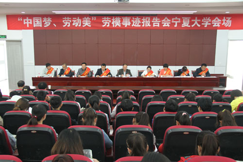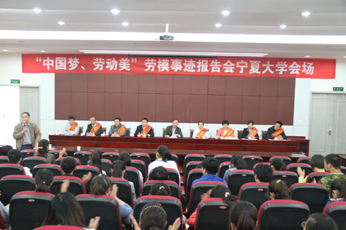【宁夏大学新闻中心讯 学生记者 张娜 李嘉敏 工会/图】为大力弘扬工人阶级伟大品格和劳模精神,宣传我区各条战线涌现出的模范人物先进事迹,营造“学习劳模、崇尚劳模、关爱劳模”的社会氛围,引领大学生树立正确价值观,5月14日,2014年“中国梦、劳动美”劳模事迹报告会在宁夏大学B区研究生二楼报告厅召开。我校纪委书记孔斌、工会主席尚晓东、各学院领导及学生代表参加了会议。
