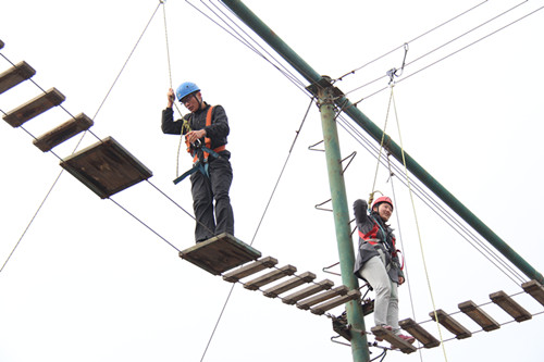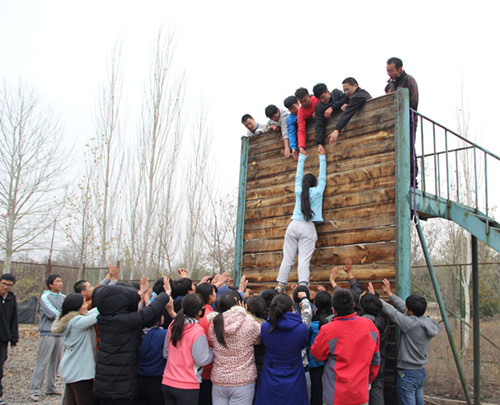 培训包括团队组建、高空挑战、击鼓传球、兔子舞、翻越毕业墙等项目。富有启发性和趣味性,充分考验着参与者彼此之间的团结、信任与默契程度。尤其是在“翻越毕业墙”项目中,同学们面对4.8米的高墙,没有任何求生工具,不允许借助外力,由同学们担任基座,借助基座的肩膀将所有队员送上高墙,从而完成逃生任务。此项挑战除了需要非常的毅力和体力之外,还需要团队的协调配合和勇于牺牲自我的英雄气概。面对挑战,每个队员都相信,只要依靠团队的力量,就一定能战胜困难。
