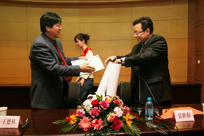 吴世彩副书记代表学校向王德林同志颁发了宁夏大学客座教授聘书,赠送了我校文化名人进校园海报。