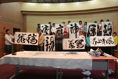 随后,王德林先生与大学生书法爱好者进行了真诚的沟通交流,对同学们提出的问题一一作了详细解答。他说道,习练书法与他几十年工作的进程是相互促进的。每当工作让他感到心烦的时候,他就练写书法,心胸越写越豁达,就能继续乐观地工作。他深情地说,一提起书法就令人心潮澎湃,书法是国粹,外国人没有这份文化传统,也无法在真正意义上移植过去。书法艺术是中国人几千年文明的沉淀,它具有一种强大的凝聚力,能拉近国人的距离,牢固地聚拢国人的心。他充满激情和智慧的演讲让同学们获益非浅。