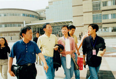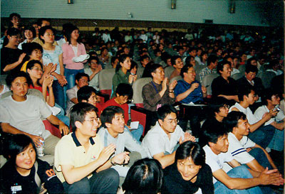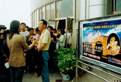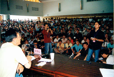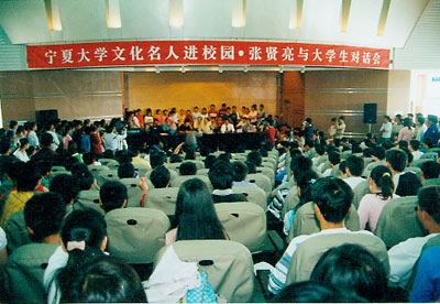 “张贤亮与大学生对话会”的开始时间是下午两点半。一点半不到,报告厅门口就有不少守候已久的同学。半小时后,报告厅里已是水泄不通。同学们高涨的热情也感染了媒体记者。两点三十分,在热烈的掌声中,宁夏文联名誉主席、著名作家、华夏西部影城董事长张贤亮先生在陈育宁校长的陪同下准时走进了会场,场内立即响起热烈的掌声和欢呼声。看到能容纳400人的报告厅内竟挤进了600多名大学生,陈校长含笑让同学们到主席台空位上就座,同学们欢呼雀跃,一涌而上,顿时,主席台前后上下都坐满了人。与主持人、报告人同席而坐的对话会使轻松、平等、民主的气氛顷刻弥漫于整个会场。