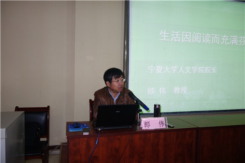 【宁夏大学新闻中心讯 中卫校区 曹强】10月24日上午,宁夏大学“塞上讲堂”中卫校区系列讲座邀请人文学院院长、博士生导师郎伟教授作了题为“阅读让生活充满芬芳”的专题讲座。中卫校区负责人马亦兵主持讲座。