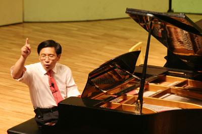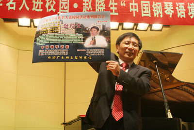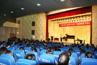 在以“中国钢琴语境”为主题的报告中,赵晓生教授谈到中国钢琴音乐的特殊性,其焦点集中于中国作曲家在写作中,引入钢琴音乐创作技巧,基于中国文化传统,富有民族表现色彩而区别于西方钢琴音乐文化传统;通过对钢琴这件西方乐器传入中国近一个世纪以来的中国作曲家们钢琴音乐作品的演奏、分析和对比,赵晓生教授认为中国已建立起一个不同于西方钢琴文化的表达方式与话语系统的中国钢琴文化的表述方式和话语环境;中国钢琴语境中包括了声韵、气韵、装饰、音响、节奏、奏法等中国音乐特殊的语汇。对每一种语汇,赵晓生教授均作了生动、详细地讲解和演示,通过对大量作品深刻的透析,充分展现了钢琴在中国的发展,和中国音乐文化赋予钢琴的新内涵。