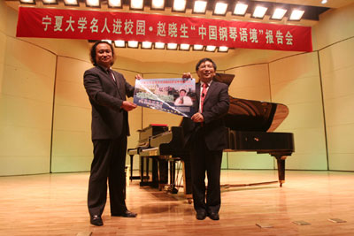 【宁夏大学新闻中心讯 邱守刚/文 李雪冬/图】5月23日,我国著名作曲家、钢琴家、音乐理论家、音乐教育家、上海音乐学院教授、博士生导师赵晓生先生走进我校“文化名人进校园”系列活动,为我校学子作了“中国钢琴语境”报告。使我校师生及区内音乐界人士有幸聆听他妙语横生、深入浅出的报告和激情洋溢、精彩绝伦的演奏。报告会后,自治区政协副主席、宁夏大学党委书记陈育宁教授亲切会见了赵晓生教授。