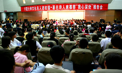 9月28日晚7时,我校校本部B区逸夫图书馆报告厅内人山人海,掌声雷动。享誉海内外的著名诗人、散文家、画家席慕蓉女士应陈育宁校长之邀,在此为我校学生作题为《我心深处——土地·族群·文化》的专题报告。我校各院系近千名师生,或挤在水泄不通的报告厅内,或在窗户外,或在报告厅外的广场上聆听了席慕蓉女士的报告。报告会由校长陈育宁教授主持。这是校党委宣传部与对外合作交流处主办的文化名人进校园系列报告第十六场。