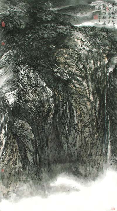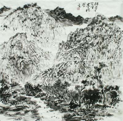 学文先生的山水画气韵生动、厚重博大,作品即集中体现了中国画单纯而又博大、雄浑的基本艺术特征,同时又具有强烈的时代气息和现代绘画视觉冲击力,他以书法入画,落笔苍茫、粗犷质朴、不雕琢、不做作,用笔求雄健畅达、纵横奔放、率真自然、大气磅礴,重整体气象,而又严守法度,画面构图对传统模式有较大突破,注重经营和节奏变化,在痛快淋漓之余,给人留下品味的余地。撖老师在创作的过程中惨淡经营,极力营造即高出于生活又平行于自然的艺术秩序,也就是他常说的心中丘壑,在其作品中不自觉地总是流露出西部人性格中的某些特征,因而又极具地方特色。他善于从传统中寻找适合当代山水的切合点和笔墨语言,为探索西部大漠山水的表现手法进行艰难尝试。多年来他顶烈日、冒风沙,坚持深入大自然“写生”在切身亲近自然的同时体悟至道。释迦牟尼说“一滴水如何不干涸,到大海里去”,生活就是艺术家的大海,撖老师深知这一点,在他的作品中常流露出写生的痕迹和原生态的味道。